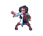 Luce una bata de laboratorio blanca con un cuello largo. Debajo lleva una camisa de cuello alto rosa oscuro con un collar blanco y un colgante verde, falda corta negra, medias marrones y tacones negros. También lleva su panfleto negro durante las peleas.