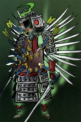 It appears as a walking suit of armor impaled with countless blades and arrows without any body, but it is actually possessed by the demon blade Goldnail, which it wields. This blade was drenched in the blood of its wielders' adversaries in numerous wars, and eventually became a demon and gained sentience.