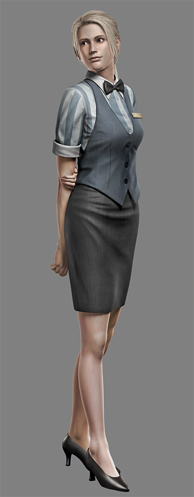 During the Outbreak, Cindy wears her J's Bar uniform, consisting of a blue and white striped shirt with a blue low-cut vest and a medium length black pencil skirt with black high-heels. Cindy's skirt has a slit in the backside that helps her with movement, allowing her to run and climb ladders more easily due to the increased flexibility the slit allows her legs; if it weren't there, the skirt would slow her down much more.