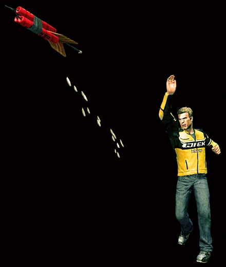 | Effect | Chuck can shoot fireworks at enemies at a relatively fast rate, clearing hordes of zombies with a short burst. The fireworks need to travel a small distance to be lethal, so Chuck should not fire them point blank or they will just bounce off an enemy before going off. Unlike weapons like a chainsaw, it does not need to be started before using it. | |||