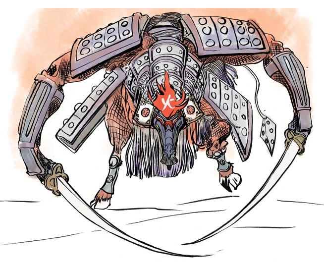 A demonic beast who occupied the Gale Shrine. It had the body and skeleton of a centaur-like creature, having the body of a bull and two arms for wielding its massive blades. Its helmet is a replicated image of Orochi's fire head.