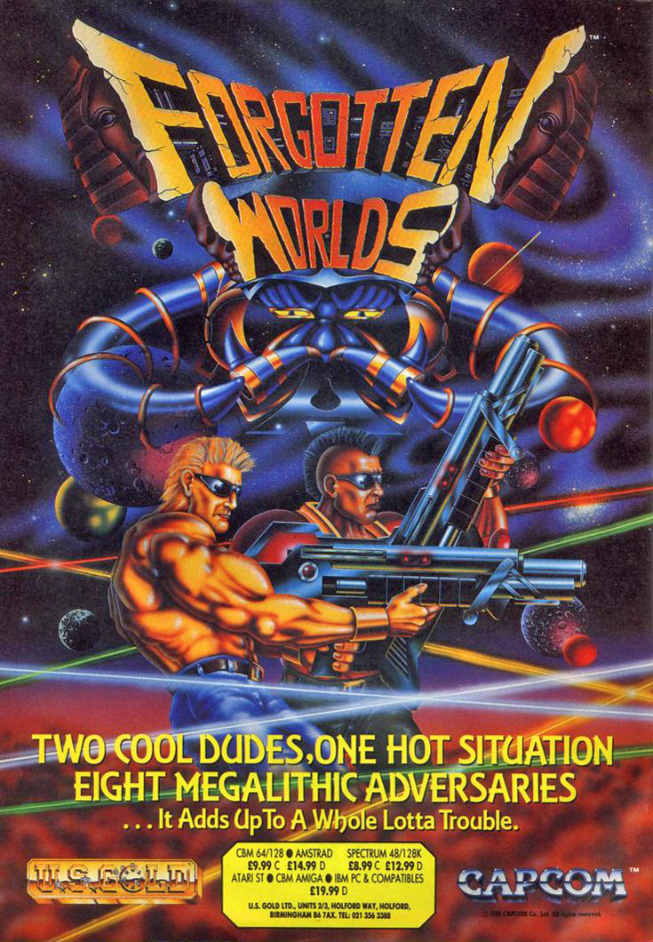 Forgotten Worlds, known as Lost World (ロストワールド Rosuto Wārudo) in Japan, is a vertical scrolling shoot 'em up arcade game released in 1988. The player takes control of a team of flying soldiers that combat the forces of the self-claimed "Celestial Emperor" Bios, a mysterious entity hell-bent on destroying all of civilization. Enemies drop money called Zenny, which players can use to upgrade their weapons and satellites in the store.