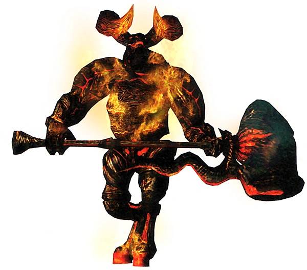 It wields a massive hammer, and its body is made of hardened lava and flame in the shape of a minotaur, as it is still haunted by the death, agony, and resentment of the damned.