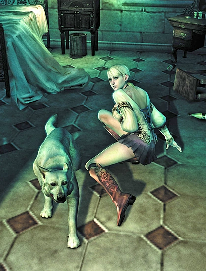 Commanding Hewie is an integral part of Haunting Ground's gameplay.[3] At the beginning of the game, he won't be completely friendly and obey all of Fiona's commands. The player will have to build a friendship and gain his trust in order to survive the game.[2] Hewie can be told to sniff out items, check suspicious areas or items, attack an enemy, or called back to Fiona's side.[2] The player can praise Hewie by petting and feeding him, both which can heal his vitality.[2] Likewise, he can be scolded when he won't listen to commands. He can be told to "stand ready" before attacking, which will increase his attack power.[2] Playing "shake hands" with Howie or healing him when he becomes injured also maintains his interest. Hewie will ignore Fiona's commands and wander off if not given enough attention, and if repeatedly mistreated he may even attack Fiona. On easier difficulty settings, Hewie can be knocked unconscious from sustaining too many injuries but can be revived. On the hard difficulty setting, he is slain after receiving the same level of injuries, causing the game to end.