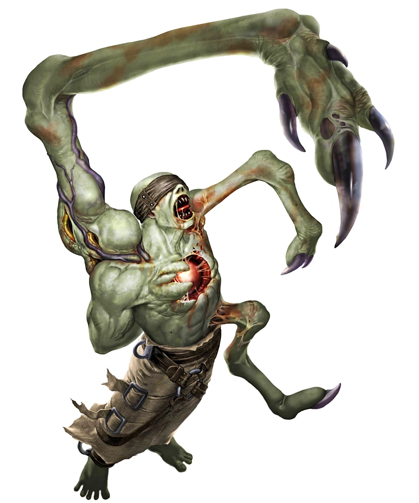 Nosferatu is a bald, pale green humanoid creature wearing a leather mask with metallic clasps covering his bloody eye sockets. His movements are restricted by an article of clothing similar to a leather skirt reinforced with metal clasps around his legs. Even though his hands are tied behind his back with leather-and-metal bindings, he can still strike out with three appendages similar to spider legs that protrude from his back. His body produces a gas that upon contact with oxygen turns into a deadly fog. Nosferatu's weak point is his heart, which is exposed on his chest.