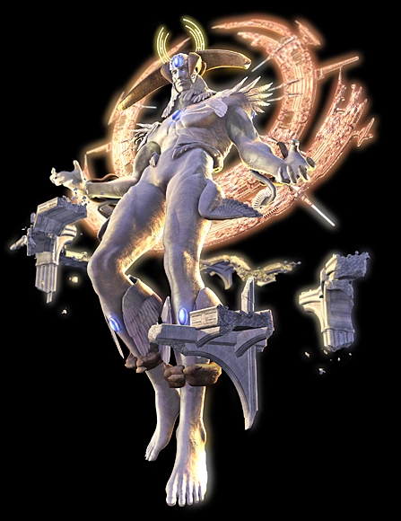 The highest level and most powerful demon summoned by the Order of the Sword. A monolithic living statue that stands several hundred feet tall and fueled by the blood of Sparda, the Savior's exterior contains millennia of spiritual and demonic matter fused together. The Savior's skin is white, with blue gems present at several points of its body. The Savior has large, golden horns at the sides of its head and it has two very large crescent symbols that hover behind it.