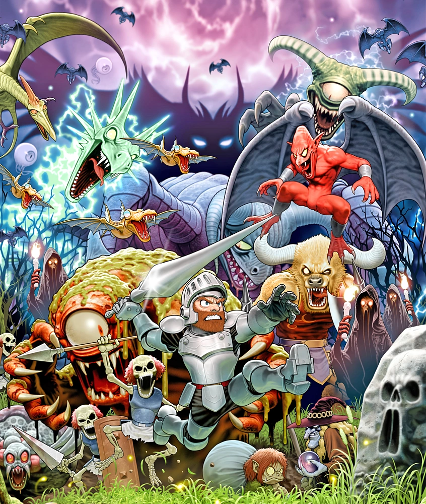 The levels are varied, ranging from being inside a more traditional haunted forest to volcanic pits and ruined castles. Enemies are hugely varied and tend to be thrown at Arthur in groups. One annoying difficult variation is the groping hand, which extends out of the ground and pins Arthur on the spot leaving the player exposed to any attack. Others range from zombies, ghosts, Giant Oxen, Green Monster plants and string dragons. The boss characters are also nicely varied, and some are incredibly huge in size (two of which take up the entire screen).