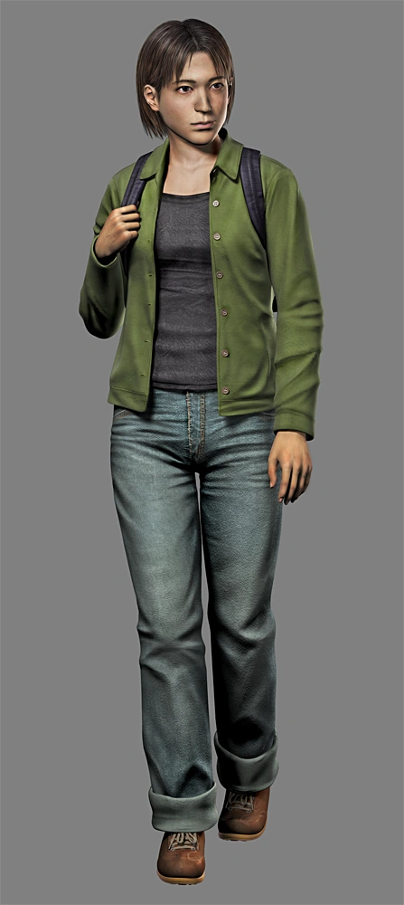 During the Outbreak, Yoko wears a black singlet with a long sleeved green over-shirt, denim blue jeans and brown shoes.